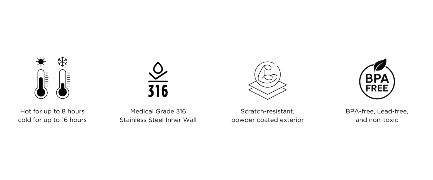 - Insulated: Keeps drinks hot for up to 8 hours and cold for up to 16 hours.